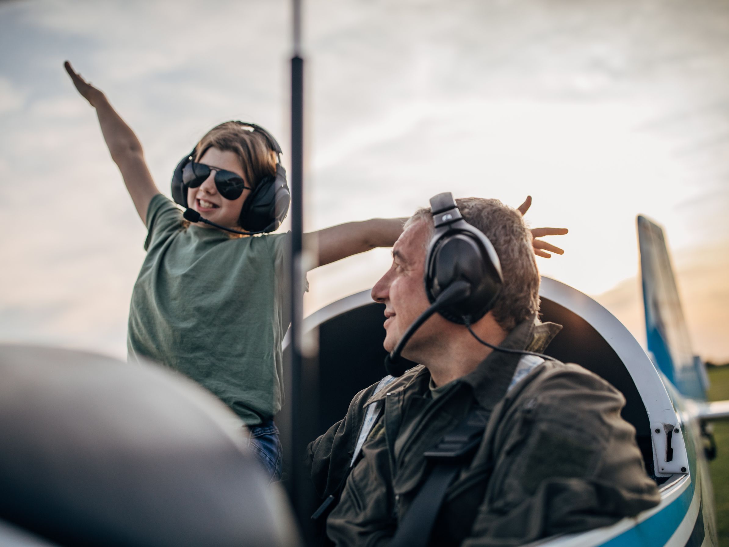 Teenager and Pilot in the cockpit of a plane giving thumbs up.